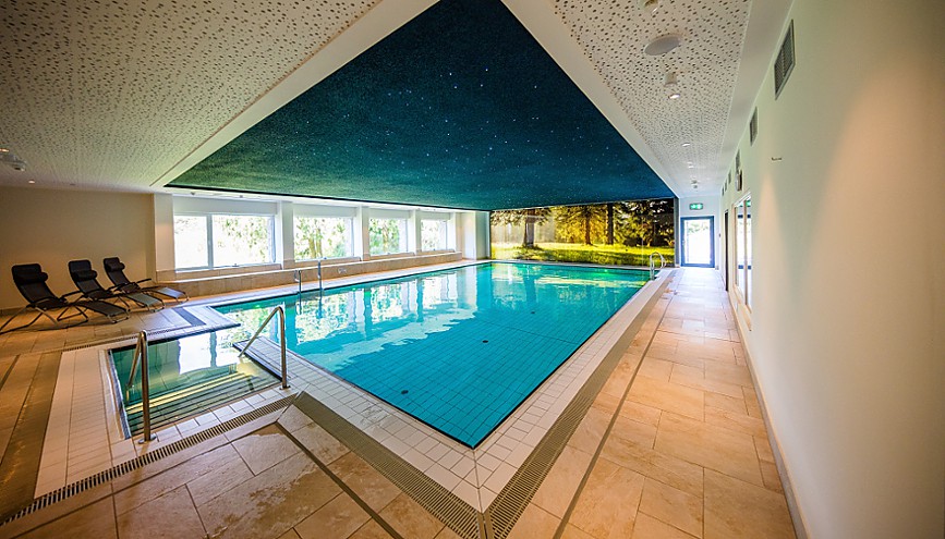 Das Schwimmbad mit weichem, mineralischem Quellwasser bei 30 Grad Wassertemperatur [Quelle: Berg- und Jagdhotel Gabelbach]