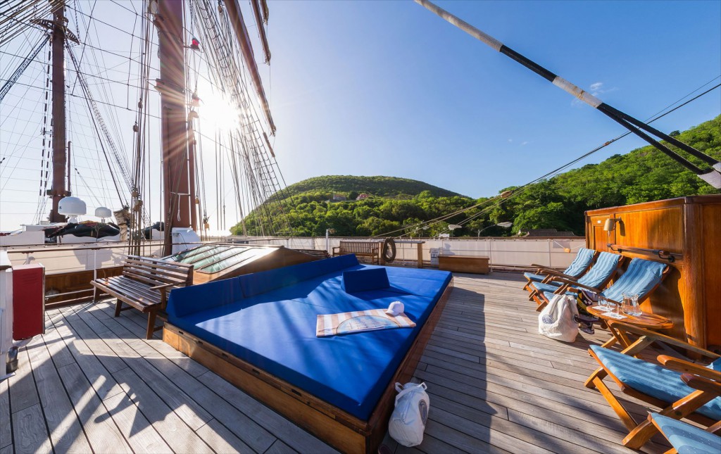 Noch heute strahlt jedes Detail an Bord den Glanz einer längst vergangenen Epoche aus. Die Eleganz der SEA CLOUD wirkt zeitlos, denn sie hat sich ihren unkonventionellen Charme bewahrt. Egal, ob man in einer der behutsam renovierten Originalkabinen, einer behaglichen Außenkabine oder einer der ehemaligen Offizierskajüten Quartier bezieht – die SEA CLOUD heißt jeden wie einen Freund der Familie willkommen. Auch im eichenholz-vertäfelten Restaurant ist von steifer Etikette nichts zu spüren. Unangestrengt genießt man an langen Tafeln in einer Sitzung die Köstlichkeiten, die die Küche zaubert, und zieht sich anschließend zum Entspannen in einen Deckchair, an die Lidobar oder in die gemütliche Blaue Lagune zurück.